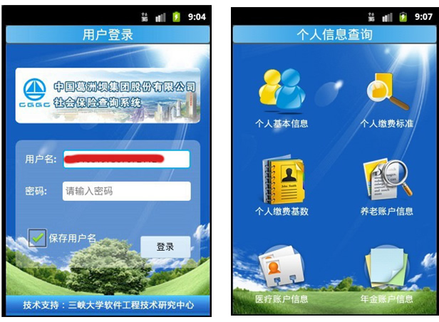 中国葛洲坝集团股份有限公司社保信息移动终端查询系统分成Android版和iOS版,用来查询中国葛洲坝集团股份有限公司职工个人、单位的社会保险信息情况.本软件可查询个人基本信息、个人缴费基数、个人缴费标准、养老个人账户、医疗个人账户、企业年金个人账户、单位职工信息、单位参保信息、单位缴费信息、单位欠费信息、单位缴费分项信息、单位缴费汇总信息、社保政策法规等信息。