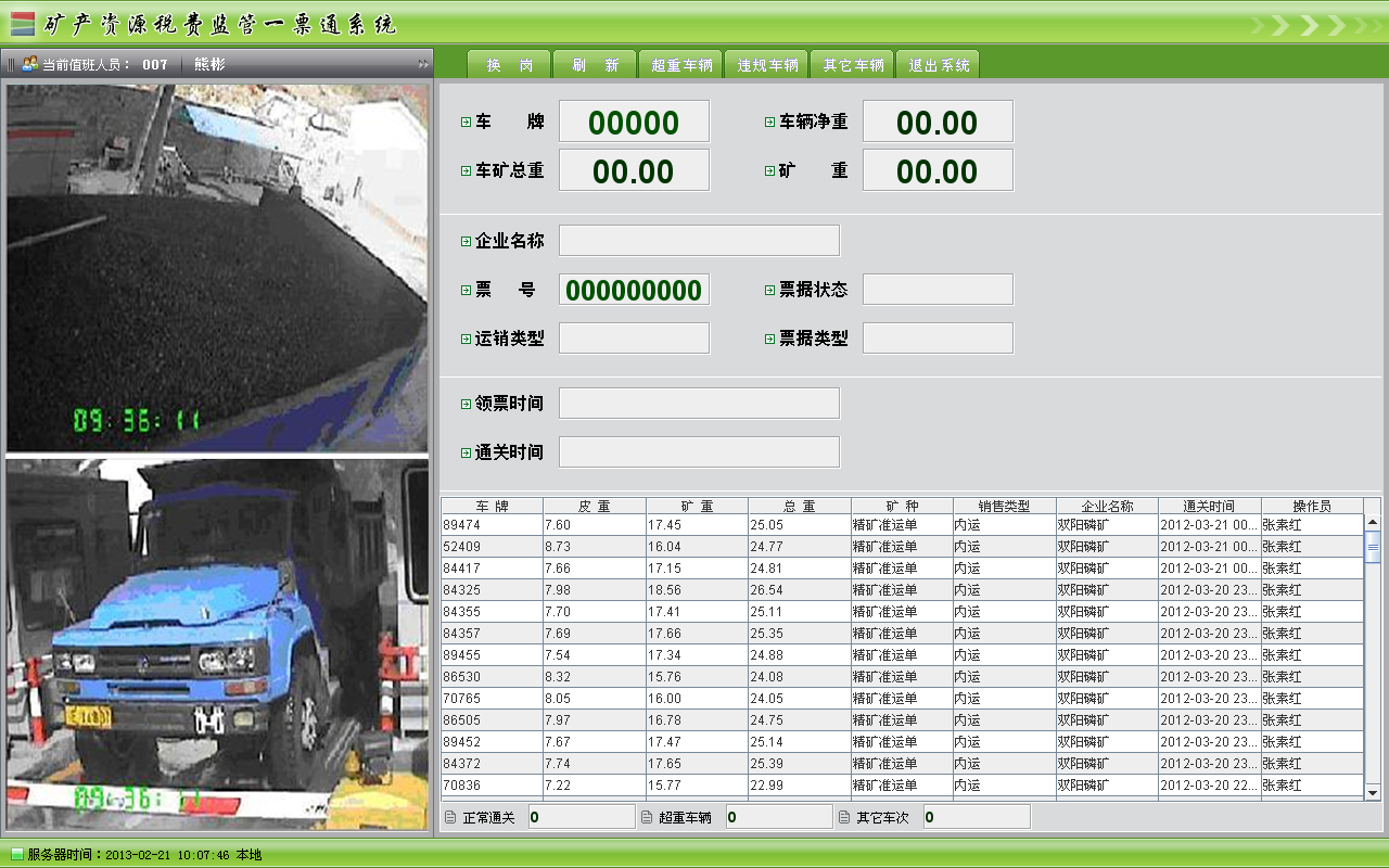 系统提供实时监控功能,通过视频叠加器对验票通过车次、净重、验票员姓名、票证号码等文字与监控图像叠加,监控人员在远端监控室可监控。实行验票与监控相分离、实时监控与事后稽查相结合,形成一套完善、系统、科学的监管体系,实现从矿产品开采到销售流通的各个环节实行全过程监管,从根本上堵塞管理漏洞、减少人为操作、杜绝税费流失,提高运矿车辆秩序、有效控制车辆超限超载等。