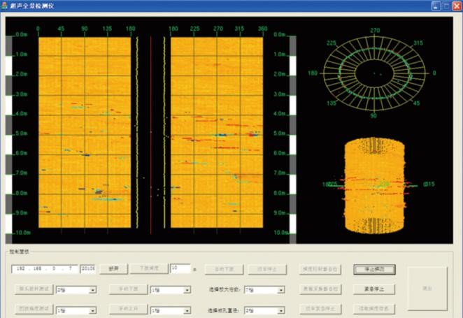 通过创新设计,本公司采用了基于探头旋转探测方式的全景式探测方案,二者探测方案示意图如下图1所示,攻克一系列难题,实现了新型大口径钻孔灌注桩全景超声侧壁检测仪的设计,产品如图2所示。该仪器利用旋转机构带动超声换能器360度旋转,以上升方式进行全自动全景式成孔检测,可以利用计算机对所得数据进行处理,以三维图像方式直观展示成孔信息,如成孔侧壁形状、材质状况、坍塌、倾斜等参数变化,为建筑工程质量控制提供更为详实可靠的依据。图3展示了仪器软件界面,可以看到成孔的立体信息以及柱面360°展开的详细信息。