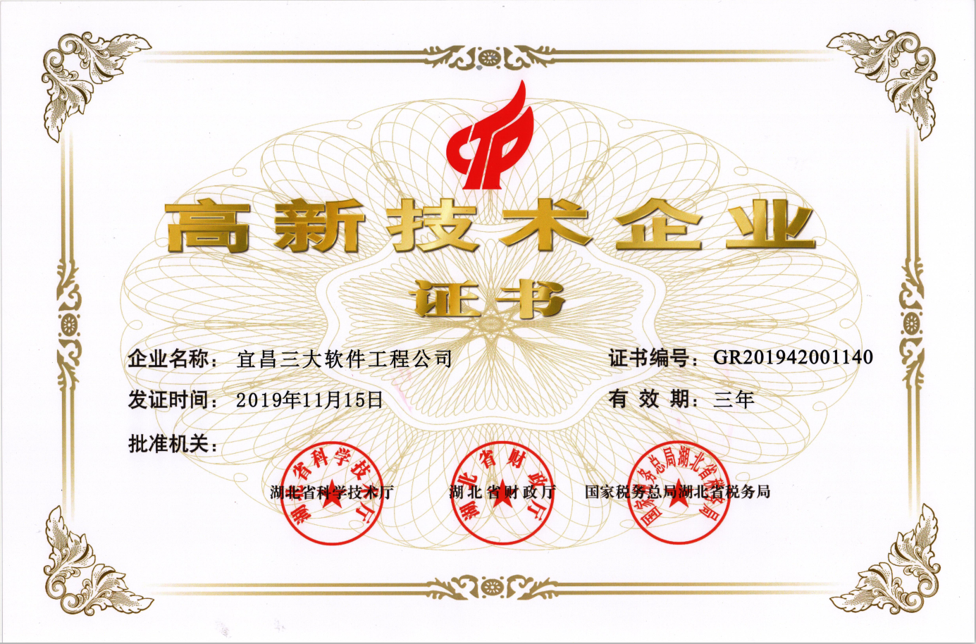 近日,我公司获得由湖北省科学技术厅、湖北省财政厅、国家税务总局湖北省税务局联合颁发的“高新技术企业”认定证书,由此正式迈入国家高新技术企业行列。