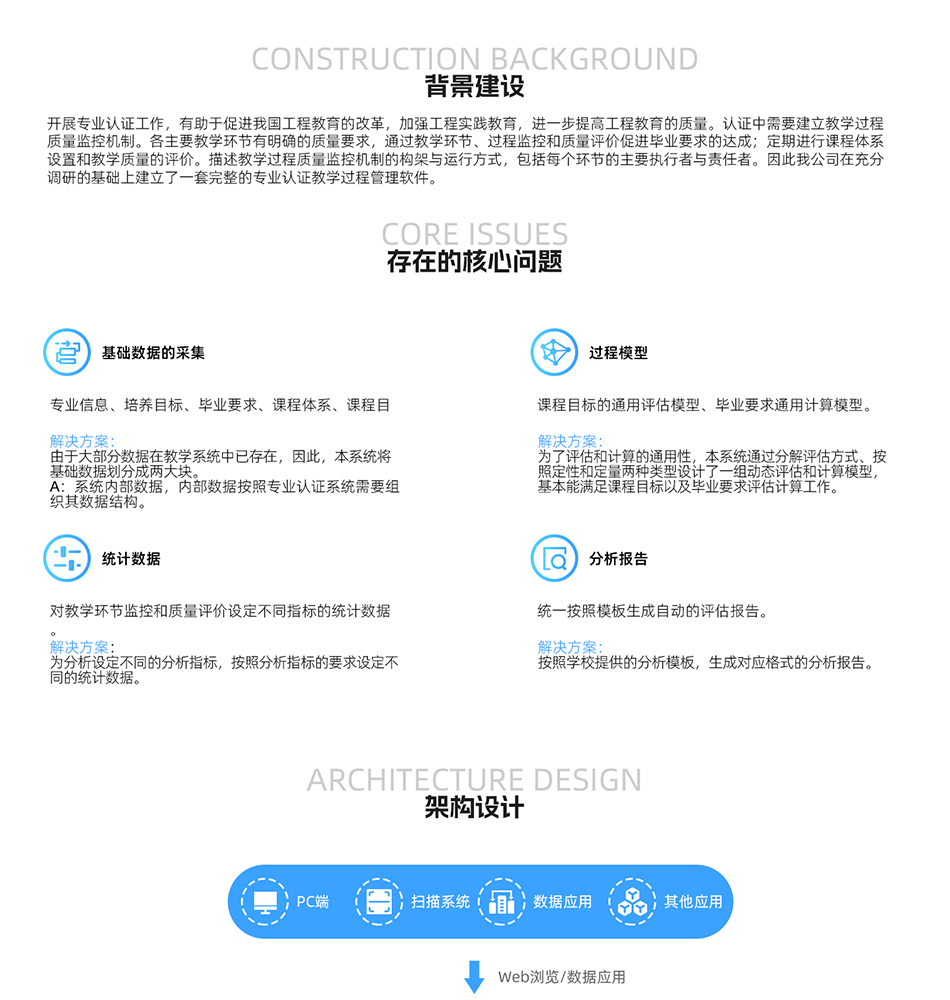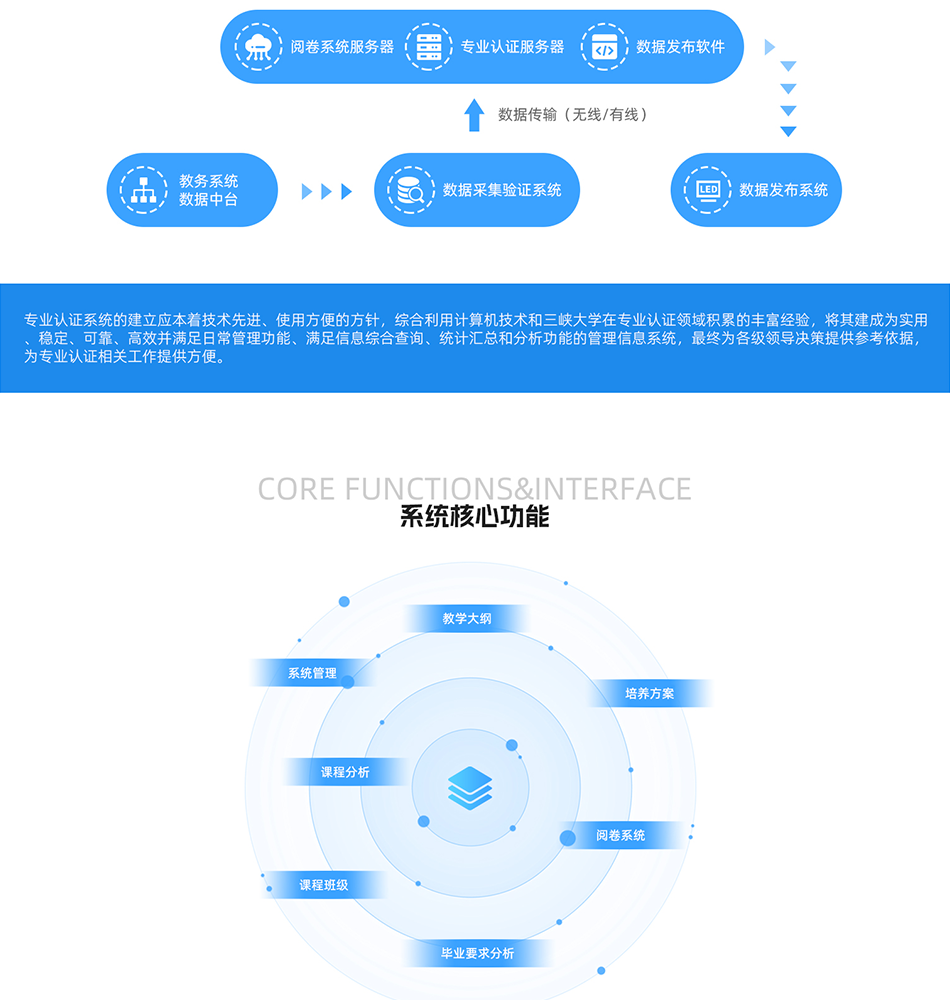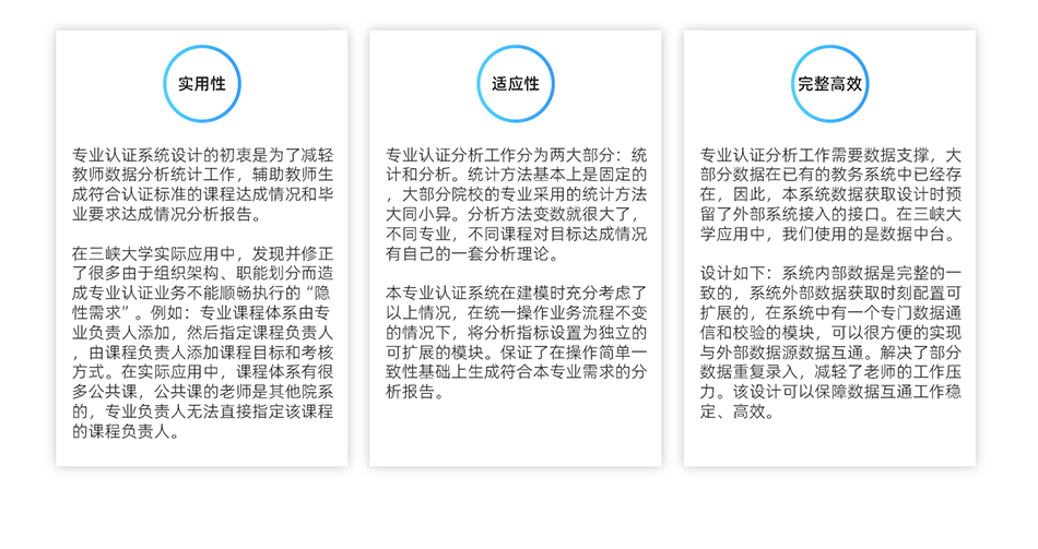 专业认证系统主要用于管理学校需要认证专业的培养目标、毕业要求、课程目标等各项认证指标达成情况,它能够将专业认证需要的各项数据有机融合起来,减轻和消除目前各项指标计算难、溯源难的情况,并对专业认证需要的资料进行分类收集整理,有利于提高专业认证工作效率,有利于提升专业认证管理水平。