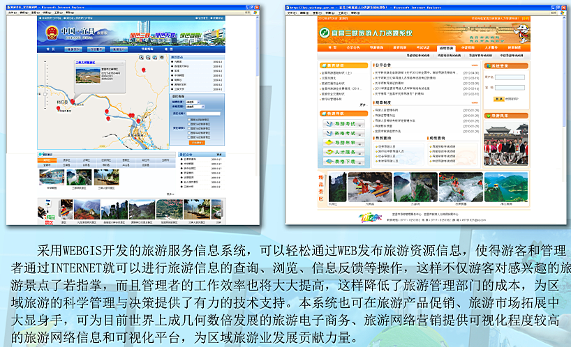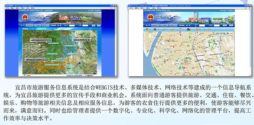 2010年公司为宜昌市政府开发的宜昌市旅游信息管理平台,有效管理宜昌市旅游相关的“吃住行游购娱”相关信息,为旅游信息管理及后期深度挖掘搭建了平台,有一定推广价值